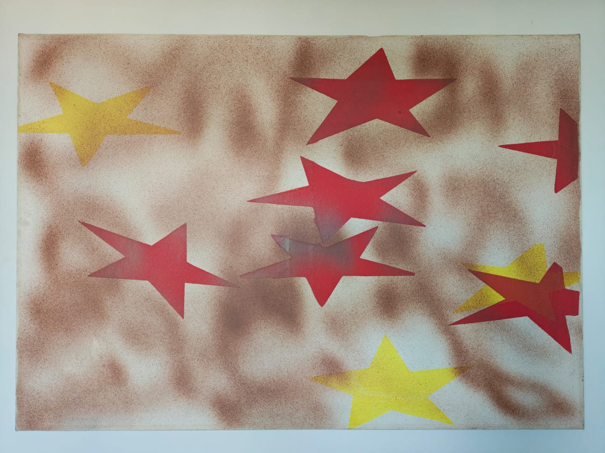 A dynamic constellation of red and yellow stars scattered across a hazy, textured background, evoking cosmic wonder and abstraction. Created during his exploration of popular culture and symbols, the work reflects Schifano’s interest in blending minimalism with the graphic language of mass media. This painting is emblematic of Schifano’s oeuvre, where recurring themes of modernity and iconography are infused with a playful yet profound aesthetic. The piece epitomises his ability to merge conceptual depth with striking visual simplicity.