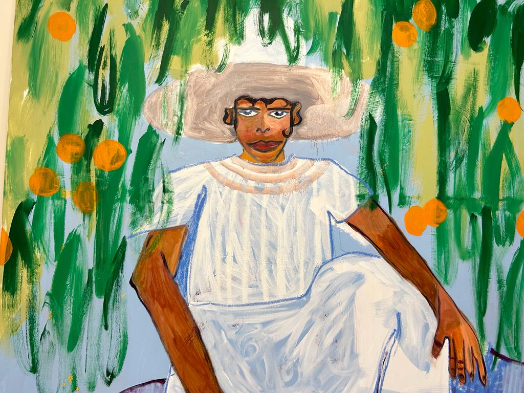 Los Naranjas (2022) by Studio Lenca is a vivid, large-scale painting that pulsates with bold colour and cultural symbolism. Known for exploring identity, migration, and belonging, Studio Lenca often draws on their Salvadoran heritage to create layered, expressive portraits. This work likely continues that exploration, featuring stylised figures rendered with vibrant hues and folkloric elements that speak to diasporic resilience and pride. Los Naranjas aligns with the artist’s established practice, combining personal narrative with broader socio-political themes in a visually striking and emotionally resonant manner, making it a compelling example of their contemporary visual language.
