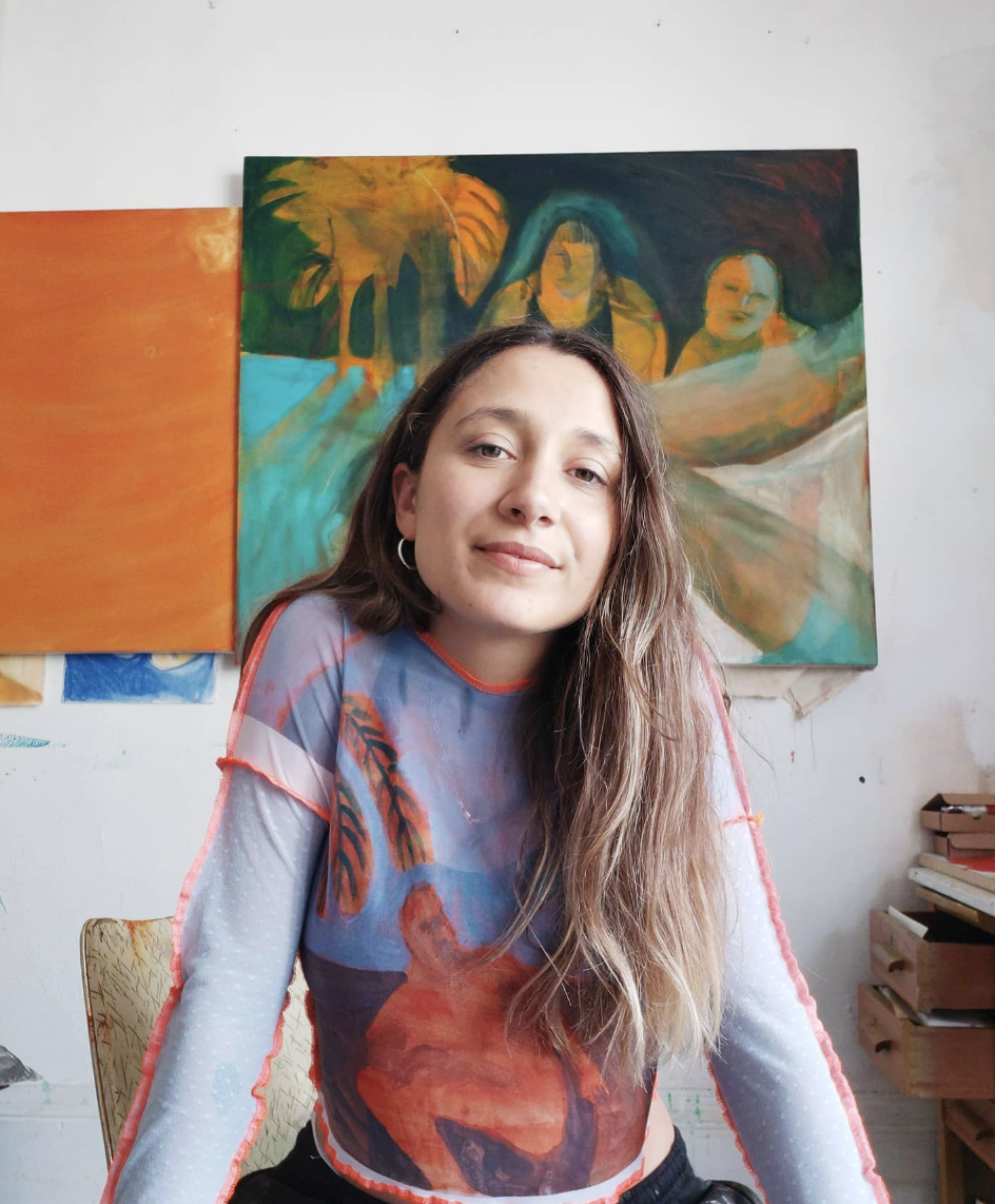 Oriele Steiner (b. 1993) explores multitudes on her canvas. She paints a series of distorted shapes and figures, each rendered in vibrant shades of blue, orange, and yellow, put together in striking harmony. Recurring motifs such as pearls, lace bras, chiffon blouses, flowing hair, wilting sunflowers, sweat droplets, and sorrowful figures appear throughout her work, bringing together different female perspectives onto one canvas. In The Desire, Despite It All (2024), bright blue nails at the end of long, fatigued, orange bodies glint with quiet defiance. Together, these symbols evoke the diversity of female subjectivities, unravelling a multitude of memories and emotions.
