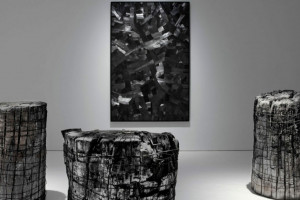 [5] Esther Schipper — “Lee Bae, Issu du feu 3g” (process description: hundreds of charcoal shards aligned, grafted, polished; wood grain/growth rings).