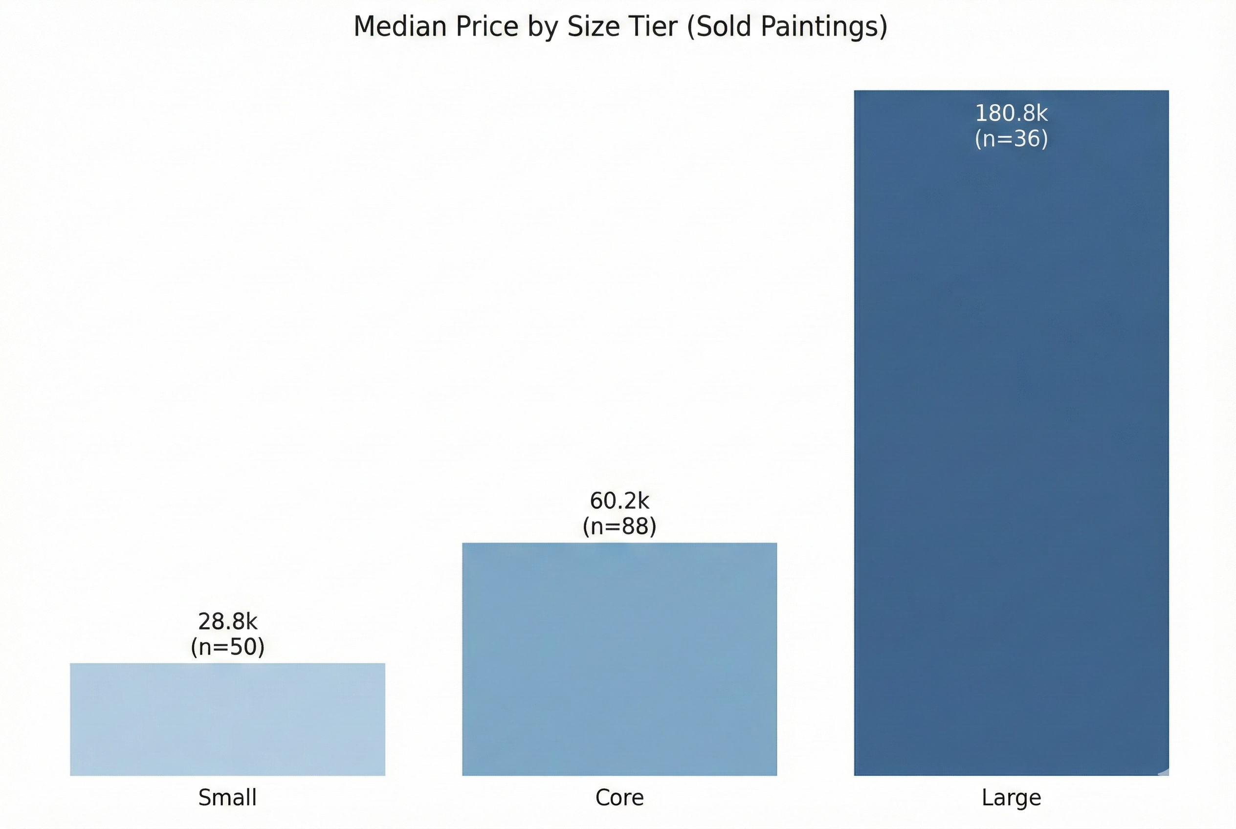The ceiling behaves differently. The top tier is dominated by large, resolved canvases that read as complete worlds. In this tape, large-format paintings have a median hammer price around US$181k. The seller implication is counterintuitive. You have more potential upside, but fewer credible exit routes. A top-tier work wants targeted placement and time. It does not want a generic sale slot where it must compete with a dozen other Italian paintings for oxygen.