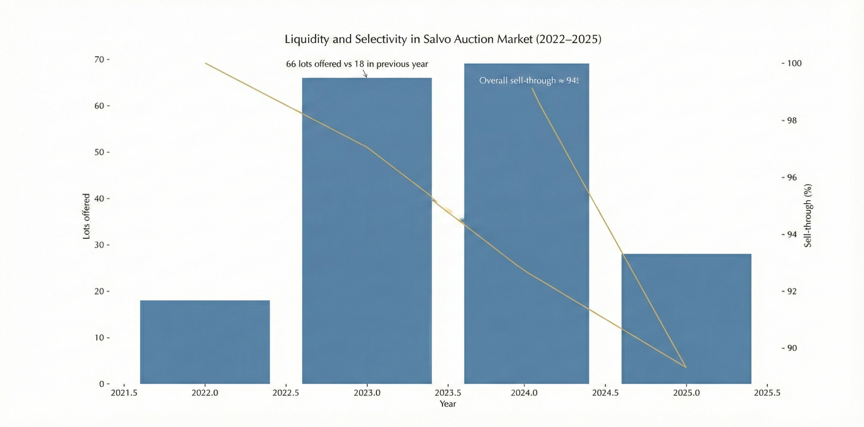 In the most recent year of sales in this data, the median hammer price is about US$52k. That median is useful because it describes where “ordinary success” lives for Salvo right now. It is also a warning. Anything that needs heroic bidding to get over the line should usually avoid a public runway.