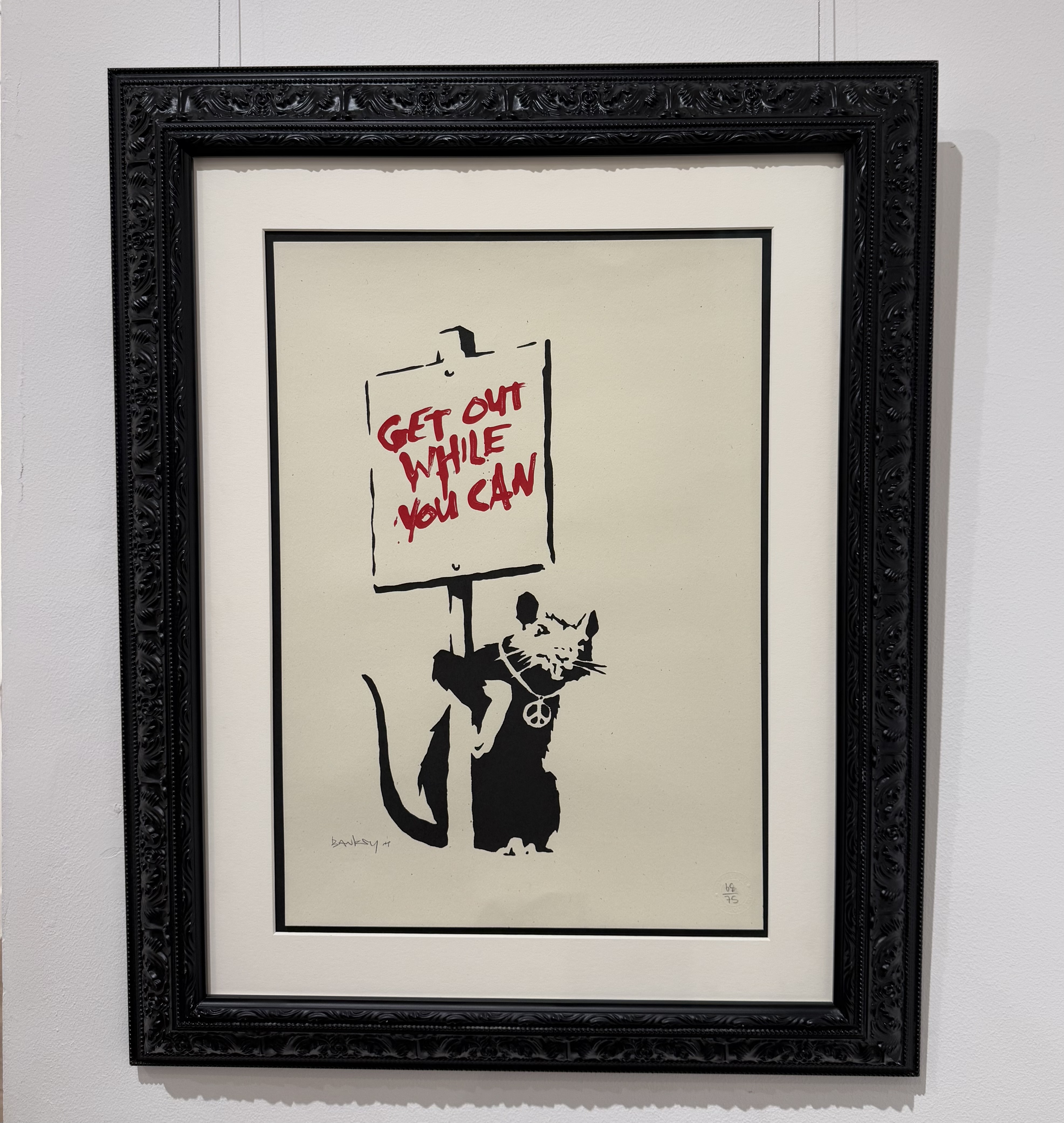 Banksy, Get Out While You Can [Red] (2004), Artscapy. Photo: © Rhea Mathur, ICONS exhibition at the Marie Jose Gallery, 2025.